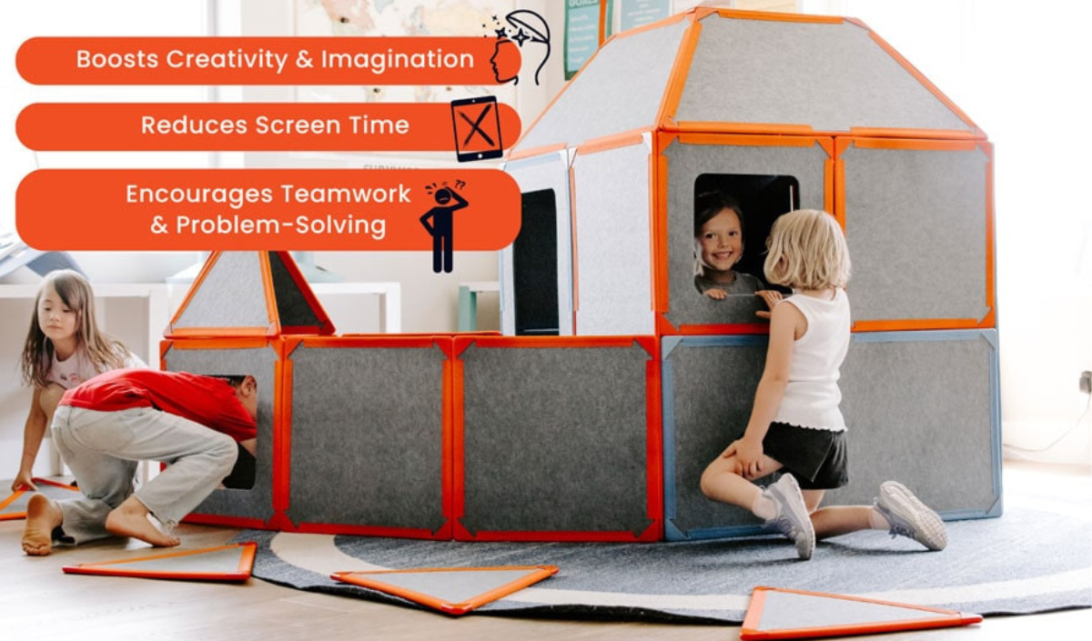 Through hands-on STEM play and teamwork, kids explore shapes, create stories, and grow, screen-free and full of joy.